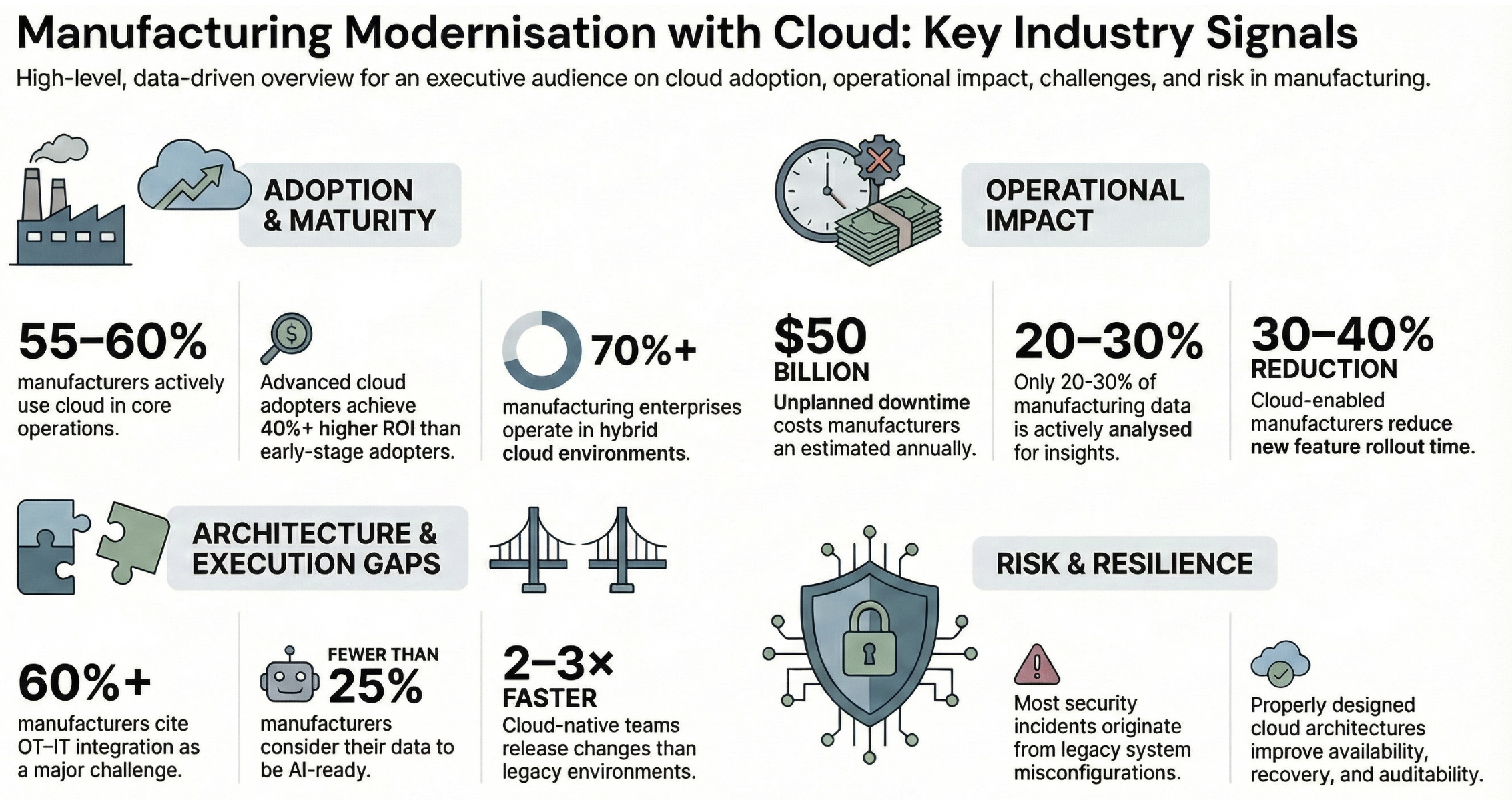 | Cloud adoption in manufacturing | ~55–60% of manufacturers actively use cloud in core operations | Cloud is no longer experimental; modernisation decisions are now about how to use cloud effectively, not whether to adopt it |